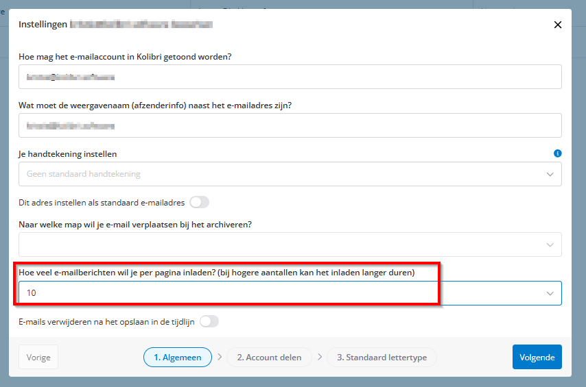 7. Pas de hoeveelheid in te laden e-mailberichten per pagina aan naar