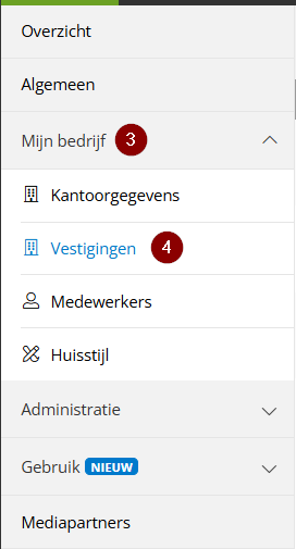 Klik op ''Mijn bedrijf'' en daarna ''Vestigingen'':