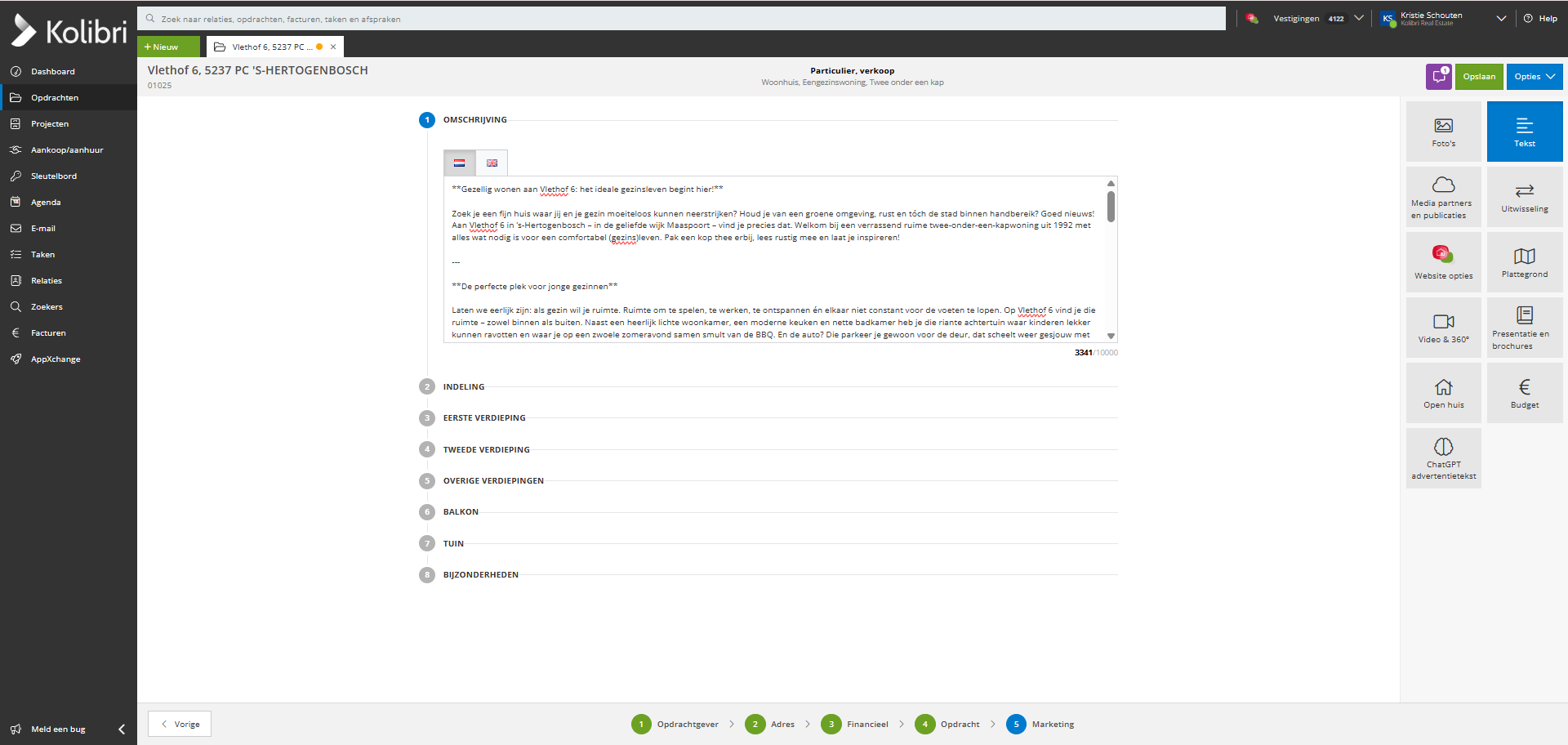 De tekst die je bij een opdracht in kunt voeren is onderverdeeld in meerdere onderdelen, Omschrijving, Indeling, Eerste verdieping enzovoort. Deze onderdelen komen overeen met de indeling van de tekst zoals die ook op Funda getoond wordt.