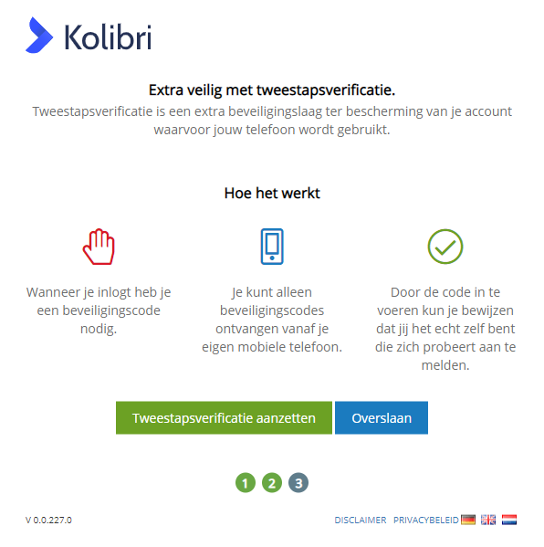 Daarna krijg je de optie om een tweestapsverificatie aan te zetten. Dit is een extra beveiliging waarbij een code via SMS naar je mobiele telefoon gestuurd wordt zodra je inlogt, zodat alleen jij met je gegevens kunt inloggen. Je kunt deze stap overslaan maar we raden ten sterkste aan om toch van deze mogelijkheid gebruik te maken.