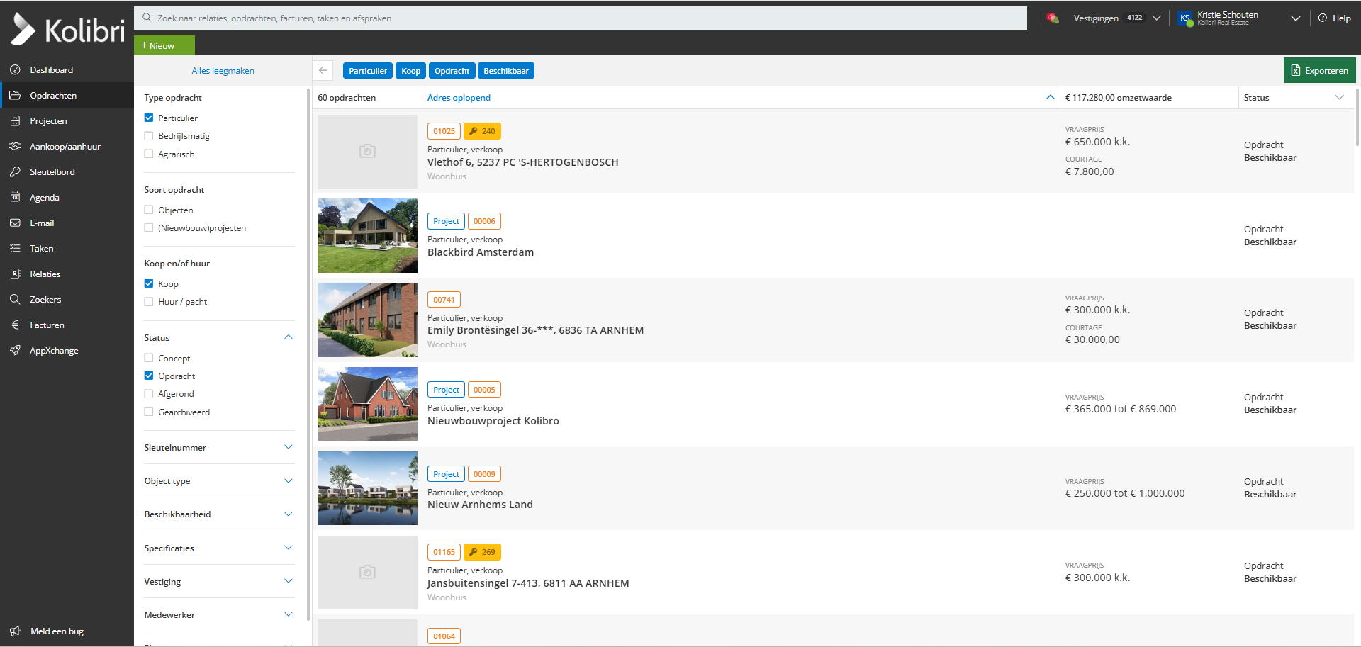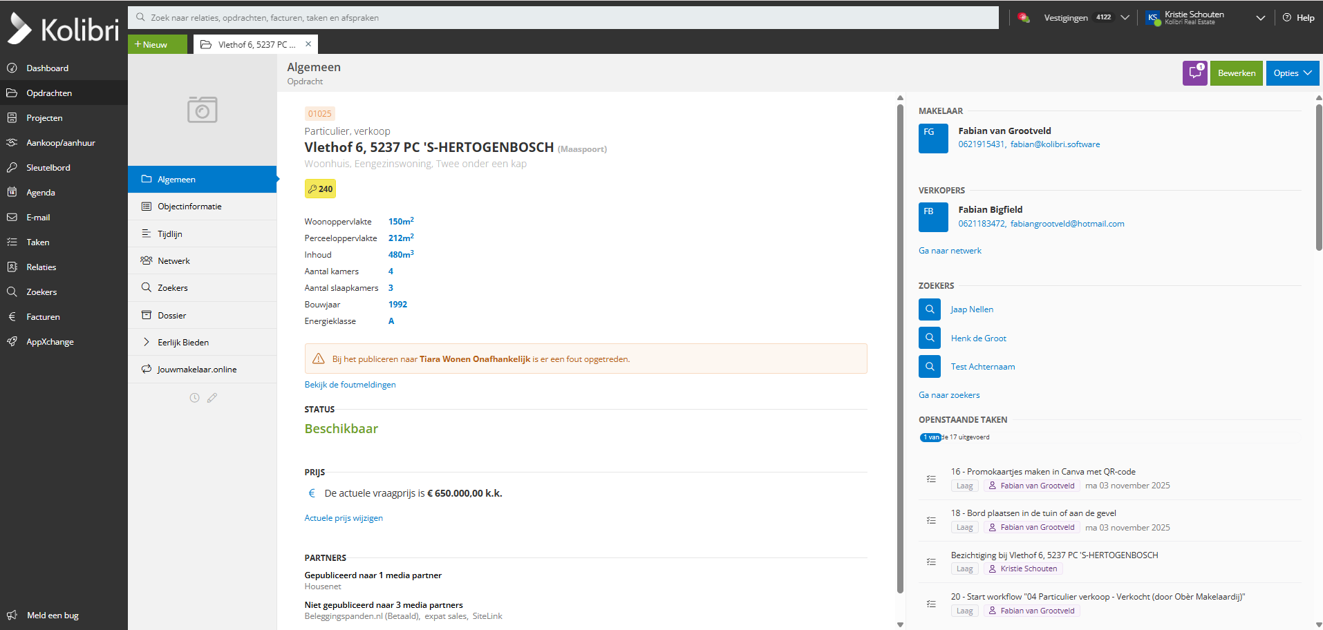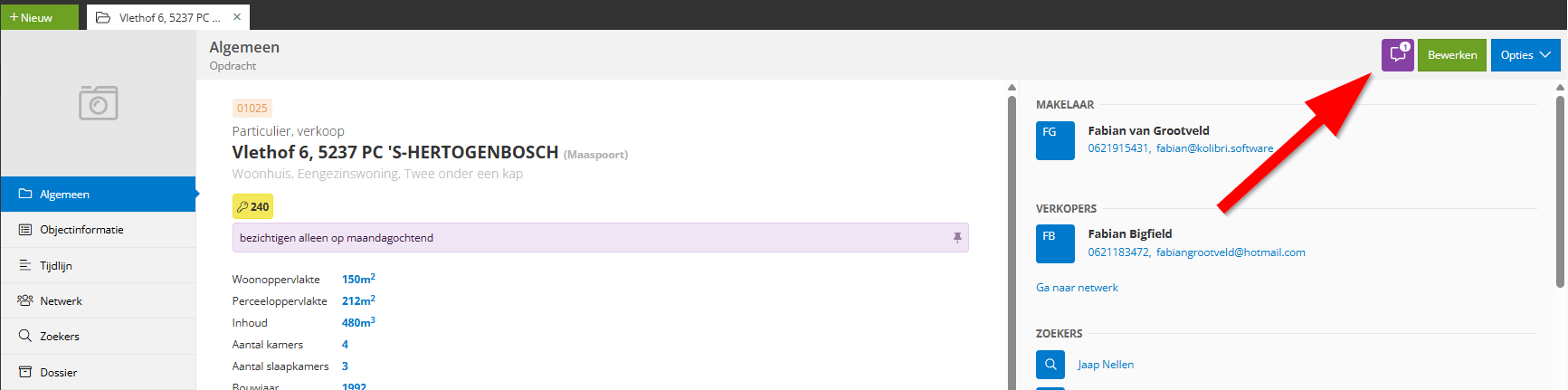 Vanuit het opdrachtenoverzicht selecteer je een opdracht door er op te klikken. Je kunt ook gebruik maken van het zoekveld bovenin door het adres in te typen. Kolibri zal dan automatisch de opdracht(en) vinden met dat adres. Je komt nu op de detailpagina van een object met een overzicht van de belangrijkste gegevens.