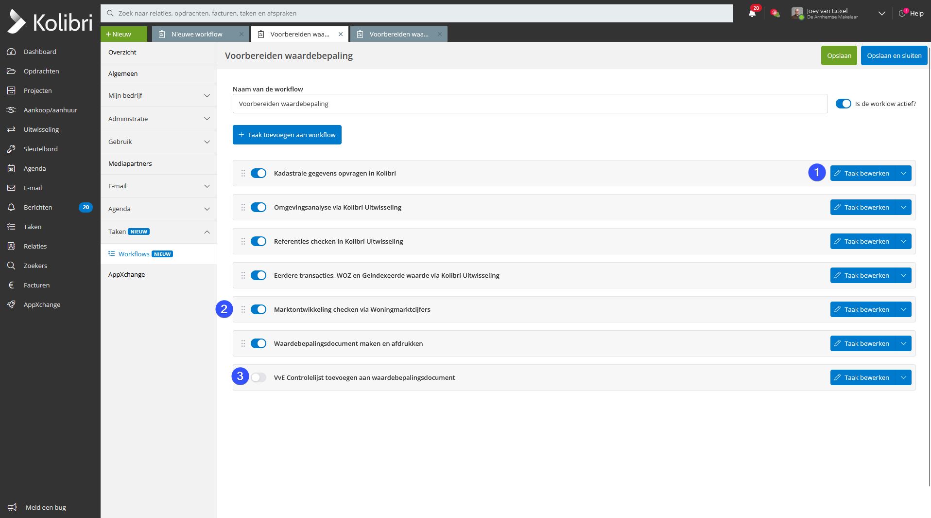 Na het invoeren van al je taken heb je een mooi overzicht van taken in deze takenlijst. Je kan taken eenvoudig bewerken of verwijderen (1). Voeg je later een taak toe en wil je deze op de juiste plek in de lijst zetten? Dan kun je de taak op de juiste plek slepen (2). Je kan er ook voor kiezen om taken bij het activeren van de workflow standaard aan of uit te zetten (3).