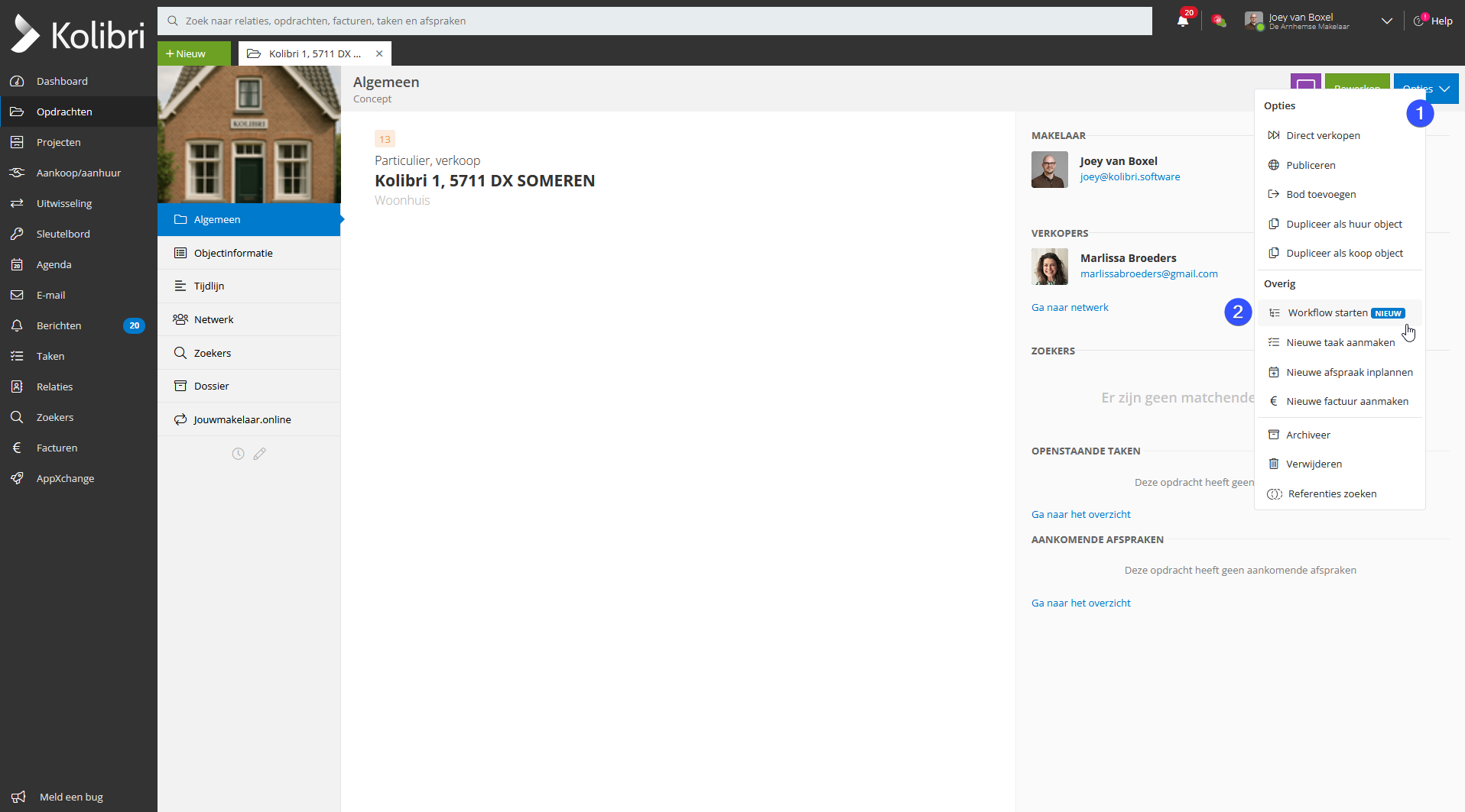 Een workflow start je eenvoudig via het opties menu bij (in dit geval) een object in Kolibri (1). Kies daar voor Workflow starten (2):
