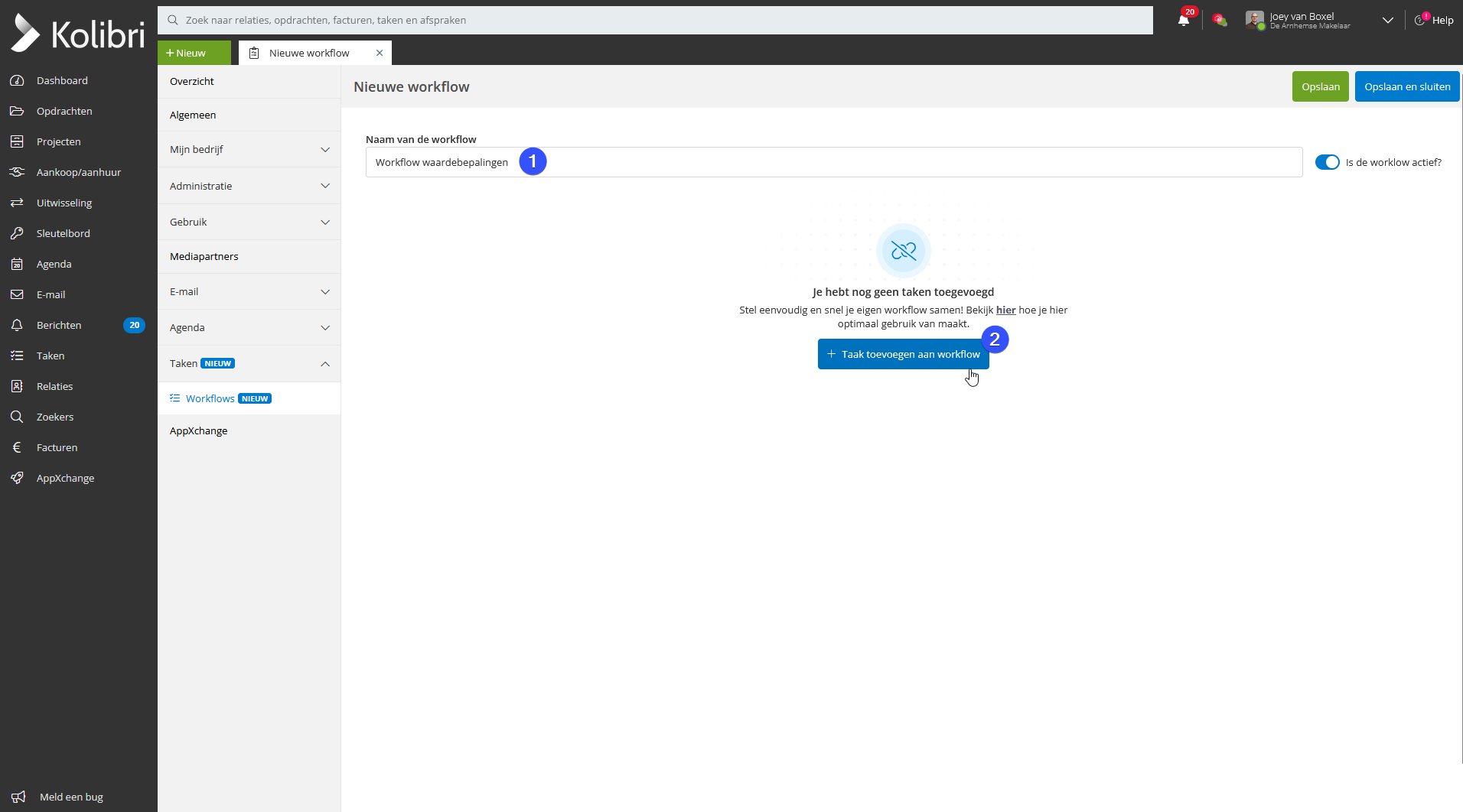 Zelf een workflow maken is heel eenvoudig. Klik op 'Nieuwe workflow toevoegen' in het instellingenscherm om van start te gaan. Je kunt workflows maken voor Opdrachten (objecten), Projecten, Aankoop/aanhuur en Relaties. Geef de workflow een duidelijke naam (1) en vervolgens kun je de eerste taak toevoegen (2).